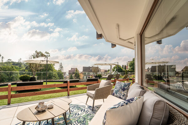 A light-flooded, open living-bedroom with a spacious private terrace, a magnificent panoramic view of the lake and plenty of space to soak up the sun, a shower room with separate WC.