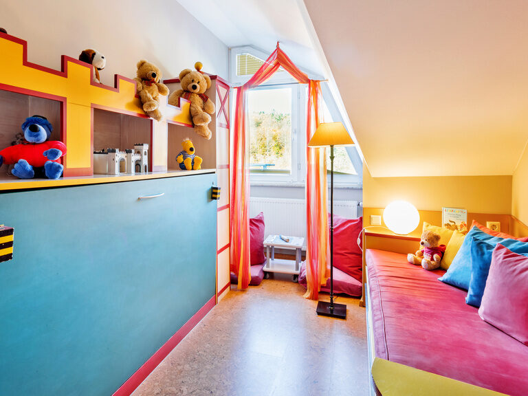 Ideal für den entspannten Familienurlaub: Ein harmonisches Wohn-Schlafzimmer mit Ankleideraum, ein exklusives Duschbad mit Doppelwaschtisch und Schminktisch sowie separatem WC. Freuen Sie sich auf leuchtende Kinderaugen im angegliederten Themenkinderzimmer für kleine Ritter und Prinzessinnen. Großzügige 50 m².