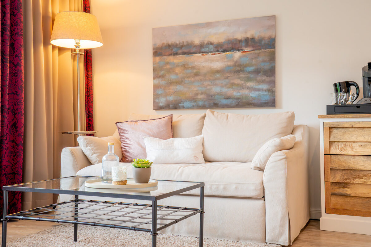 Ideal für den Romantik-Urlaub zu zweit: Liebevoll eingerichtetes Wohn-Schlafzimmer, Balkon mit Blick auf die traumhafte Seekulisse und ein Duschbad überwiegend mit separatem WC. Romantische 30 – 35 m².