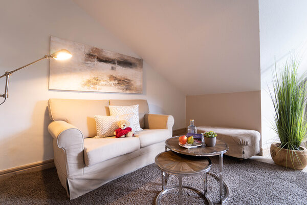 Für Ihren kuscheligen Kurzurlaub: Wohn-Schlafbereich mit Duschbad. Gemütliche Winkel auf 26 m². Im Turm - Zimmer.