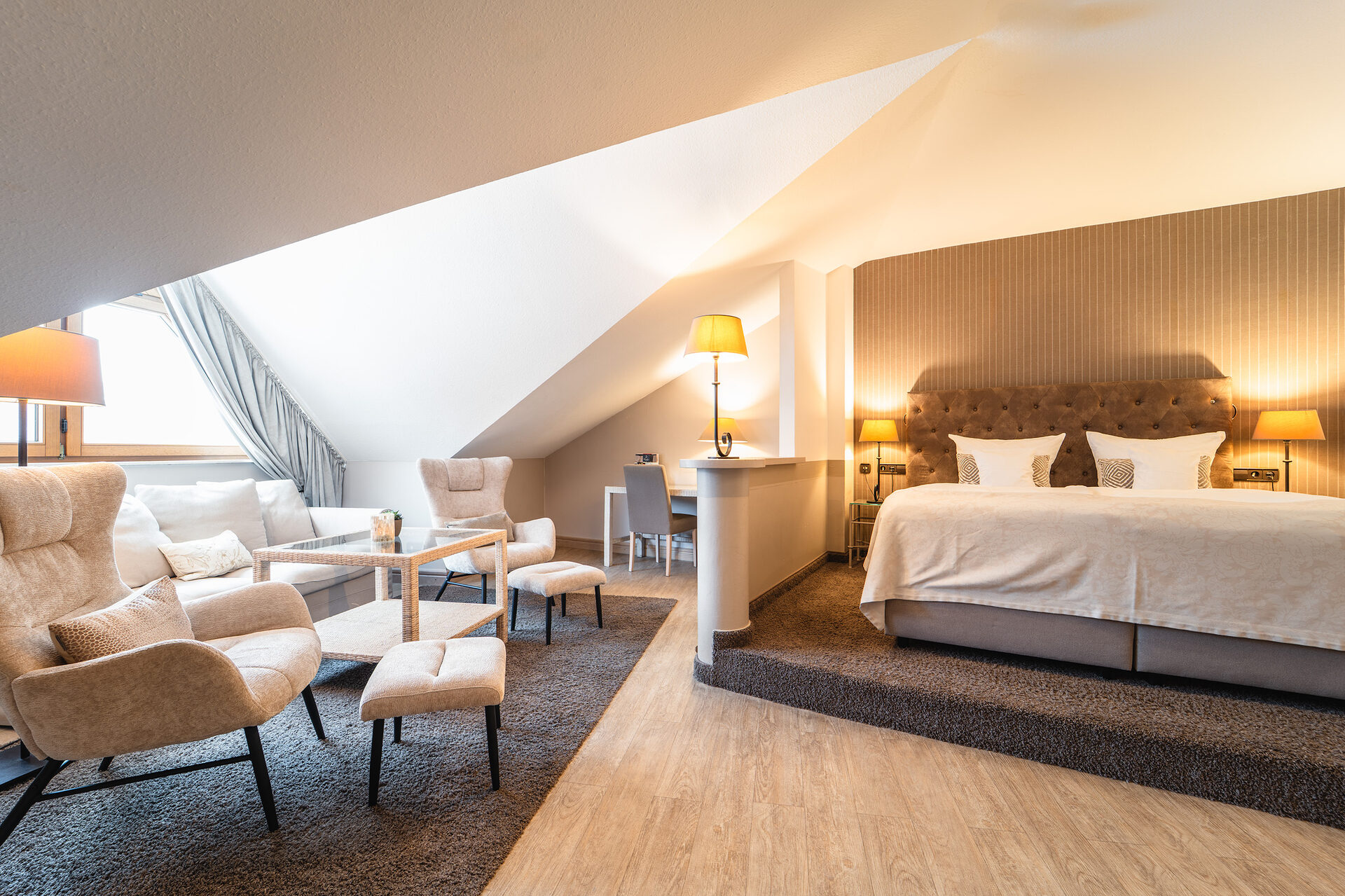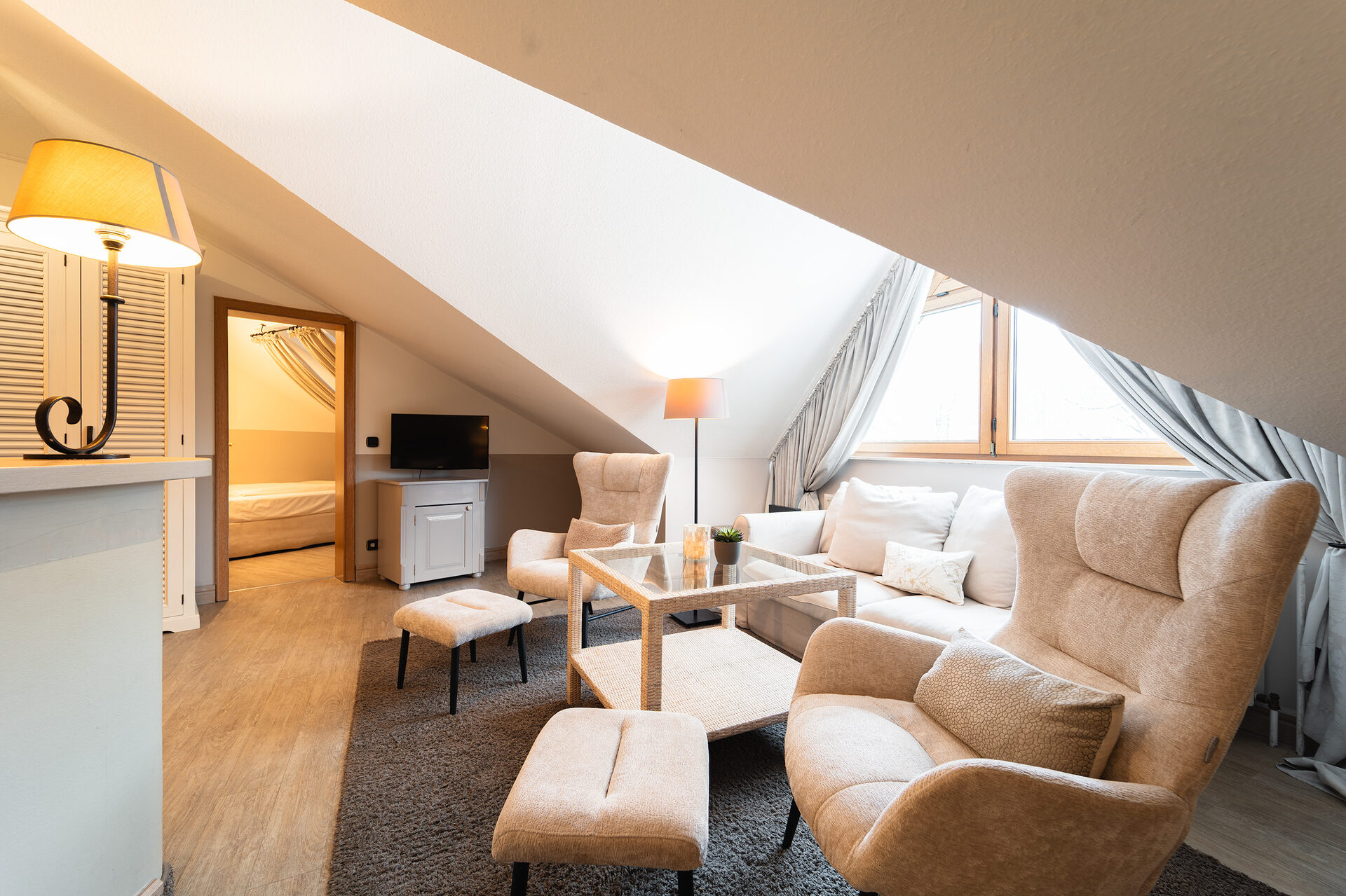 Für einen unbeschwerten Urlaubsgenuss: Gemütliches Wohn-Schlafzimmer, Duschbad und genügend Rückzugsmöglichkeiten dank dem separaten Kinder oder Schnarcherzimmer mit französischem Bett und eigenem TV für KiKa & Co. Gemütlichkeit auf 40 – 45 m² in unserem Turm Familienzimmer.