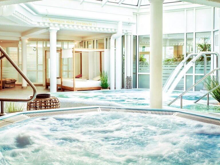 Take a dip in our year-round heated outdoor pool "Laguna SPA" at any time of the year. In summer, relax on comfortable loungers around the pool, feel the warmth on your skin and enjoy a fruity cocktail or treat yourself to a glass of champagne. Then, after a soothing sunbath, a refreshing dip awaits you in the pleasantly temperate water. In winter, you can use the covered entrance and won't get cold feet.