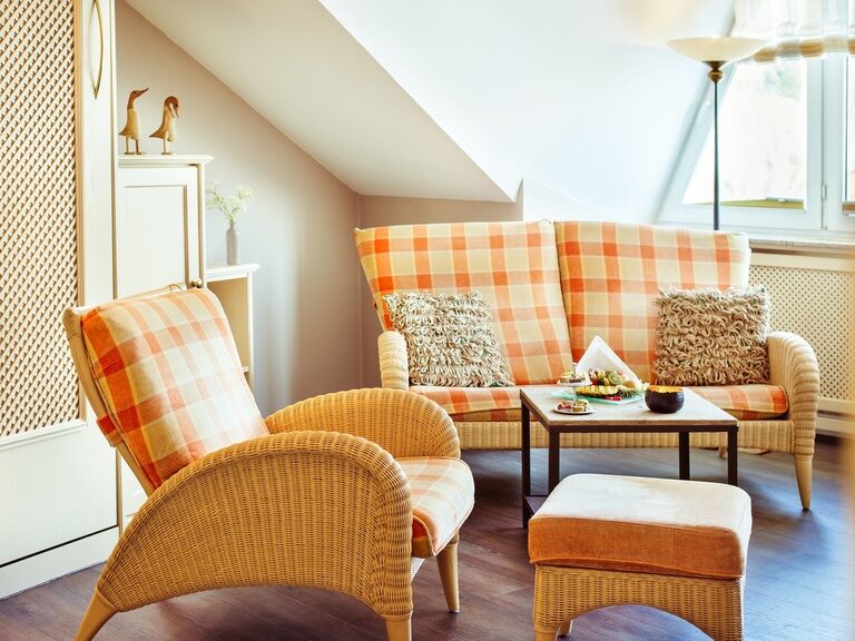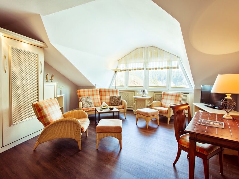 Perfect room pleasure: Whether friends or family, this suite offers space for up to 4 adults. A large entrance area, a living room, a bedroom, a large dressing room, a shower bath with double washstand, dressing table and WC, as well as an additional shower bath. A luxurious 80 m². Just perfect for your wellness holiday.