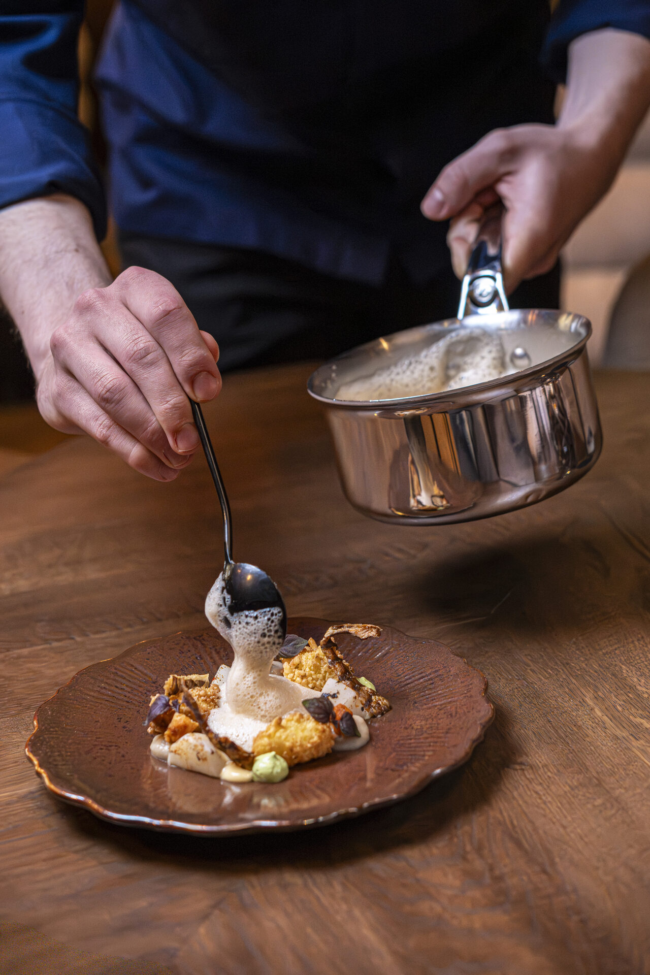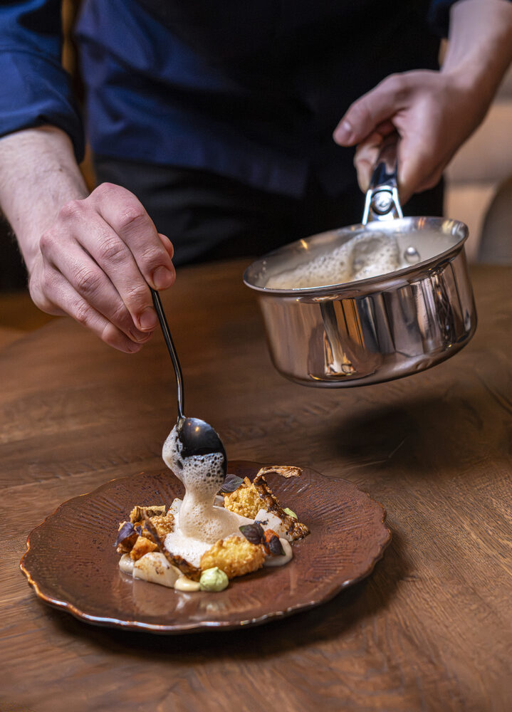 Erhaschen Sie Einblicke in die Kreativität von Chefkoch Ralph Hollokoi und seinem Team, die in diesem ganz besonderen familiären Rahmen auf der Front-Cooking Station die Speisen zubereiten, während sie aus dem Nähkästchen plaudern.